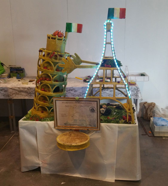 ТОРАЊ у Пизи шеретски накривљен према "загрљају" Ајфелове куле, трава од зелене салате, украси од чери парадајза, неизбежни лајт-шоу и заставе - италијанска и француска. Ништа не би било необично да ова макета није направљена од - теста за пицу! Зато и не чуди што је њен креатор, Александар Ковачевић (36) из Логвија у Француској, победио на Светском шампионату мајстора пице недавно одржаном у Парми.