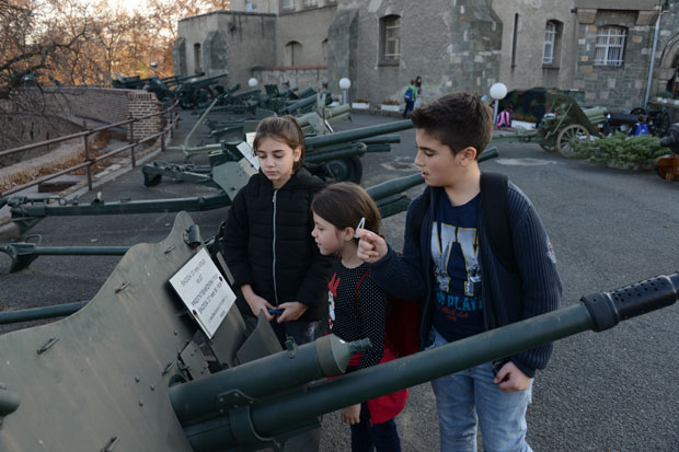 И на Калемагдену, испред Војног музеја растрчао се велики број малишана. Сликају се поред топова. Видели су изложбу, па су пуни утисака.