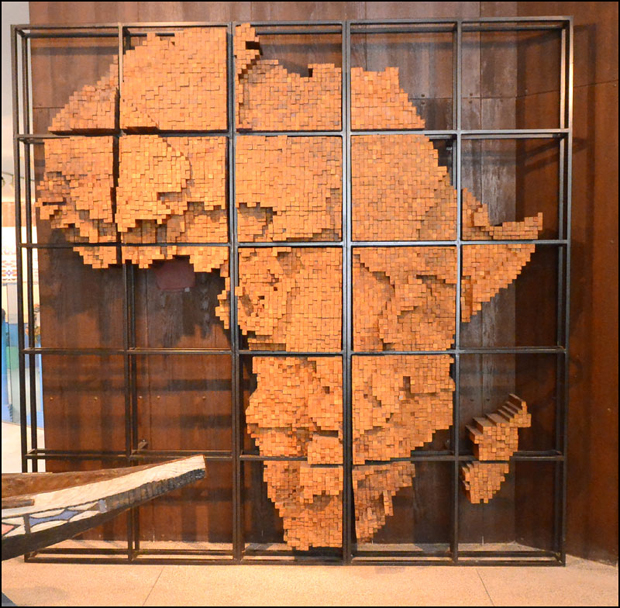 Kruženje Muzejom afričke umetnosti završavamo ispred posebne skulpture - simbola Afrike, koji je namenski sačinio umetnik Kolja Milunović. Posebno za ovu raskošnu instituciju Milunović je siluetu ovog kontinenta sačinio od posebnih letvica koje su u Beograd donete iz Gane, kao simbol Afrike.