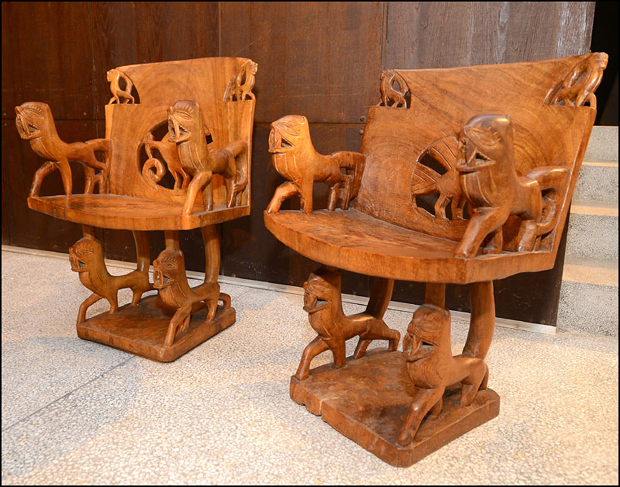 Pred nama je i garnitura koju je muzeju podario jedan diplomata iz Benina, a sve stolice su nalik minijaturnim tronovima na kojima su sedeli visokodostojnici. Na svakoj stilizovanoj stolici su skulpture lavova, bivola ili drugih moćnih i svetih životinja kakve su, simbolički imale i sve druge kulture.