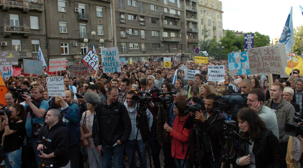 Na početku protesta okupljeni su minutom ćutanja odali poštu Slobodanu Tanaskoviću koji je radio kao noćni čuvaru Hercegovačkoj ulici, gde su maskrine osobe porušile bagerima više objekata.