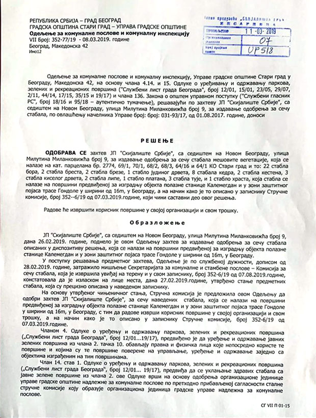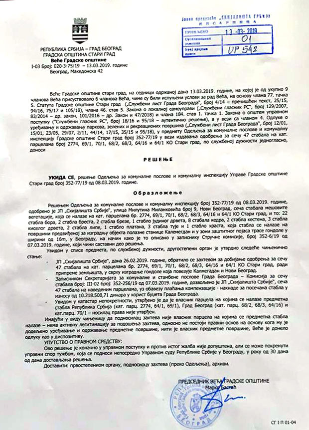 Predstavnici opština Stari grad i Novi Beograd potpisali rešenja o seči, ali je u Starom gradu na sednici Veća ukinuto rešenje i pokrenut postupak protiv rukovodioca Odeljenja za komunalne poslove