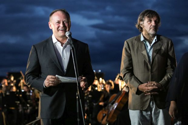 Na otvorenoj sceni, nastupio je čuveni violinista Roman Simović sa Simfonijskim orkestrom "Boljšoj", pod dirigentskom palicom Srboljuba Dinića. Uživala je publika u izvođenju "Uvertire 1812" Čajkovskog i "Slikama sa izložbe" Musorgskog, u nesvakidašnjem ambijentu obojenim vatrometom nad klasikom ukroćenom mokrogorskom divljinom. Ratnički taktovi "Uvertire 1812" poklopili su se sa zaglušujućim vatrometom, u Kusturičinoj režiji...