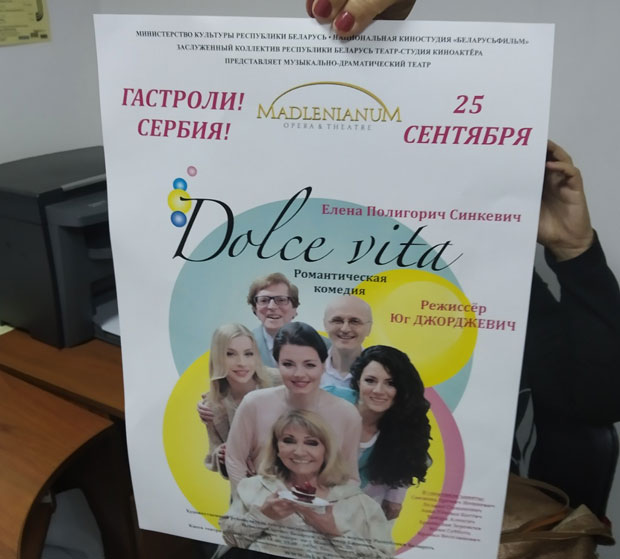 ROMANTIČNA komedija "Dolče vita" i šestočlana glumačka ekipa Madlenijanuma, u sredu uveče je u Minsku ispraćena na nogama toplim aplauzom dobrodošlice. Sala Teatra Kinoaktera bila je ispunjena do poslednjeg mesta, a radoznalost publike da vidi umetnike iz Beograda utoliko veća što je ovo prvo pozorište iz inostranstva s kojim je potpisan protokol o saradnji za gotovo četiri decenije postojanja.