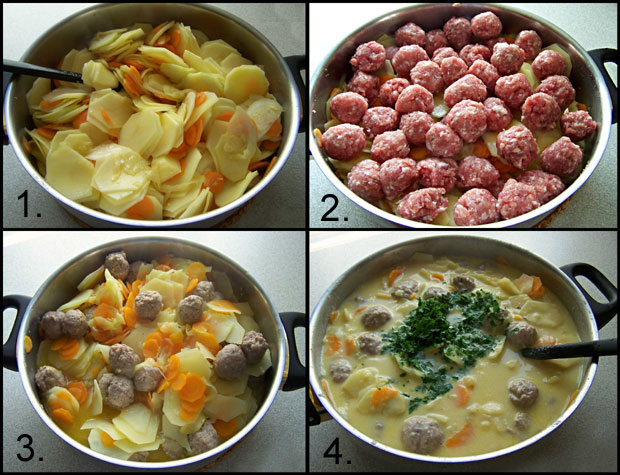 2 – Meso istisnite iz kobasica, oblikujte ćuftice, poređajte preko povrća i nastavite dinstanje. Kada proključa, posudu poklopite, smanjite temperaturu i kuvajte još pet minuta.