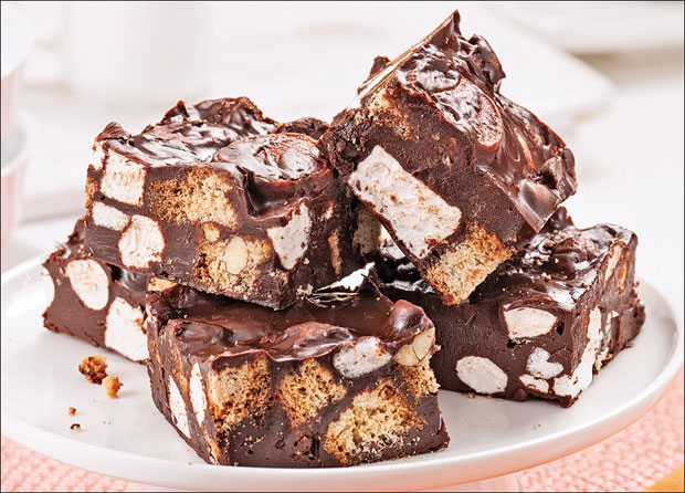Obložite masnim papirom četvrtasti kalup dimenzija 20 h 20 cm. Zagrejte zaslađeno mleko na umerenoj temperaturi, dodajte puter i čokoladu i lagano mešajte dok se čokolada ne rastopi. Potom umešajte izmrvljeni keks i puslice, pažljivo izmešajte drvenom kašikom, sipajte u kalup i ostavite da se ohladi na sobnoj temperaturi, a potom u frižideru 1-2 sata. Ohlađenu smesu isecite na 16 kocki.