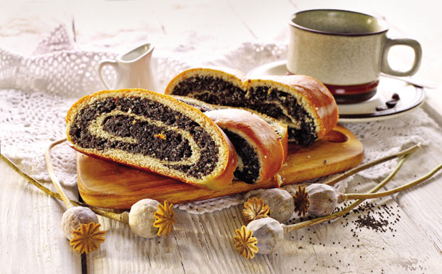 Mak pomešajte sa šećerom, vanilin šećerom i cimetom. Jednu koru stavite preko druge i rasporedite trećinu kisele pavlake, pospite trećinom mešavine maka i šećera i trećinom opranog suvog grožđa. Savijte kore u rolnu i stavite u podmazan pleh. Ponovite postupak sa preostalim korama i filom. Uvijene pite premažite sa malo ulja ili kisele pavlake i pecite u rerni na 180°C oko 30 minuta. Pečene rolne pospite šećerom u prahu.