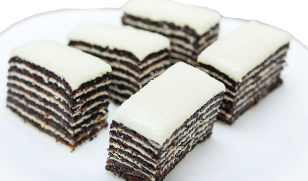 Potrebno je: 6 jaja, 12 kašika šećera, 1/2 pakle (125g) margarina, kesica praška za pecivo, kesica cimeta, 200 g mlevenog maka. Čokoladna glazura: 100 g čokolade, 100 ml slatke pavlake.