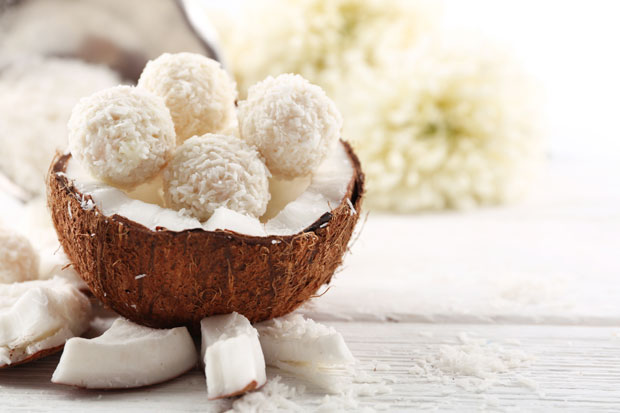 Stavite šećer i vodu da provri, a onda ostaviti da ključa na najjačoj temperaturi 3 minuta. Smanjite potom temperaturu pa dodajte puter. Kada se rastopi pomerite sa vatre i postepeno sipajte mleko u prahu muteći sve vreme mikserom. Dodajte zatim 200 g kokosa, promešajte i ostavite da se ohladi. Od ohlađene mase pravite kuglice, u svaku stavite lešnik ili badem, valjajte u kokos pa stavljajte u korpice ili ređajte na tacnu.