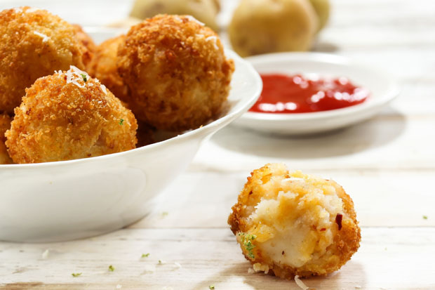 Oljuštite i isecite krompir na kocke, kuvajte ga dok ne omekša, pa ga procedite i izgnječite u pire. Dodajte maslac, mleko i začine, promešajte i ostavite da se ohladi. Dodajte brašno i zamesite testo, pa formirajte loptice. U svaku lopticu stavite kocku kačkavalja u sredinu i ponovo oblikujte. Uvaljajte loptice u susam i pržite u zagrejanom ulju, dok ne dobiju zlatnu boju. Gotove loptice poređajte preko ubrusa, da se ocedi višak masnoće.