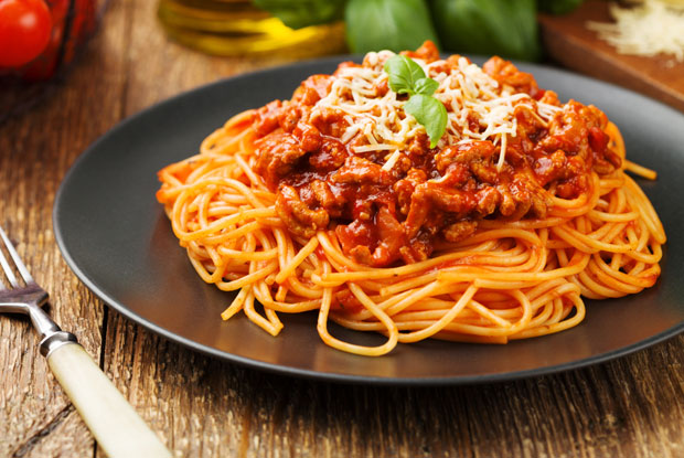 Potrebno je: 300 g špageta, 250 g mlevenog mesa, 0,5 dl paradajz sosa, 1 glavica crnog luka, 2 čena belog luka, 3 kašike bosiljka, so, biber