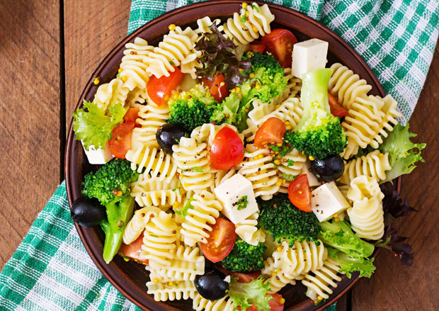 Potrebno je: 300 g fusila, 20 crnih maslina, 100 g brokolija, 4 paradajza, 8 kockica sira po želji, malo maslinovog ulja, so, biber