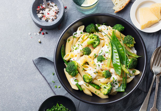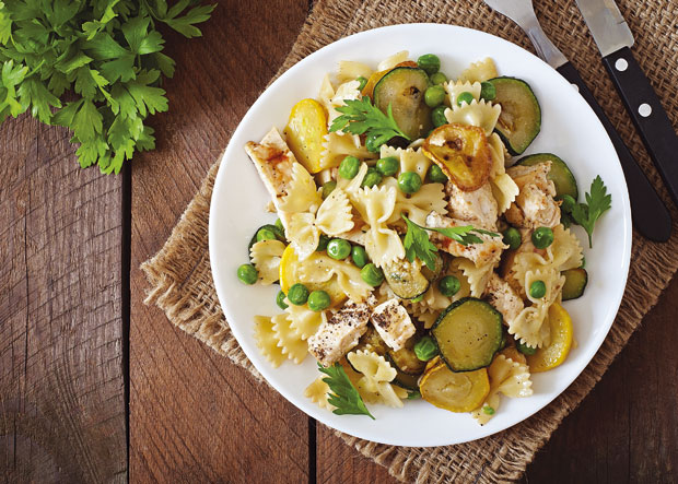 Potrebno je: 300 g testenine, 400 g pilećeg belog mesa, 1 tikvica, 50 g graška, 250 ml pavlake za kuvanje, 2 čena belog luka, 1 glavica crnog luka, 100 g parmezana, so, biber, biljni začin, peršun ili bosiljak