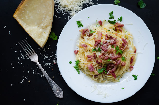 Slaninu isecite na tračice i propržite je na ulju, pa je izvadite u tanjir i preko nje stavite beli luk. Umutite jaja, pavlaku, 50 g sira, dodajte malo soli, bibera i mlevene paprike. Kuvane špagete prelijte sa slaninom i lukom, a zatim umešanom smesom jaja i pavlake. Dodajte preostali sir i po želji ukrasite peršunom.