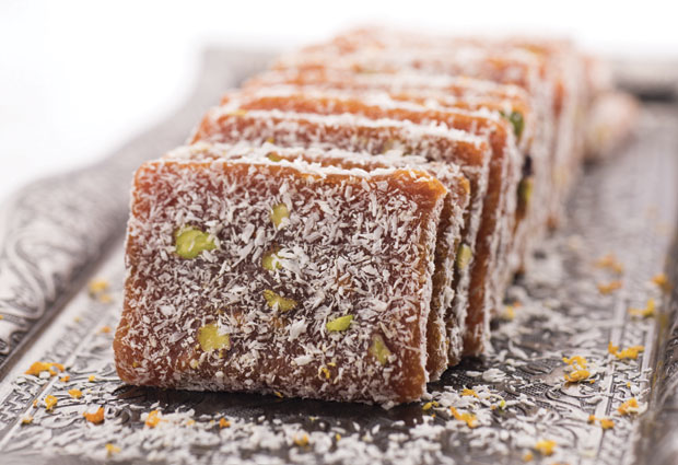 Potrebno je: 100 g suvog grožđa, 100 g suvih urmi, 100 g suvih smokava, 100 g suvih šljiva, 100 g suvih kajsija, 100 g pistaća, sok i kora od pomorandže, kokosovo brašno, šećer u prahu