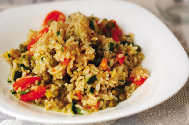 Potrebno je: 250 g kuskusa, 30 g maslaca, 200 g zaleđenog graška, 2 paradajza, 2 struka mladog luka, crvena paprika, 125 g feta sira, 50 g pinjola, maslinovo ulje, sok od pola limuna, pola veze peršuna, so, biber