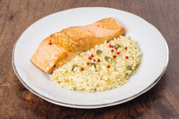Odreske lososa stavite u lonac i prelijte vodom taman toliko da pokrijete ribu. Dodajte biljni začin i list lovora i kuvajte na laganoj vatri oko 10 minuta. Kad je losos skuvan, izvadite ga iz šerpe i očistite od kostiju. Narežite na manje komadiće. Obarite pirinač u slanoj vodi, potom ga isperite hladnom vodom. U dublju činiju stavite pirinač, losos, malo bibera, sok od pola limuna, sitno iseckan mladi luk, čeri paradajz isečen napola, masline, malo maslinovog ulja i lagano promešajte.