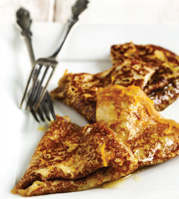 Ispecite palačinke od testa za palačinke. Napunite ih orasima, makom ili sitno seckanim komadićima jabuka i po želji dodajte šećer pomešan sa vanilin šećerom i cimetom. Zatvorite palačinke kao trougao i složite na tanjir. U duboku činiju sipajte jaje i žumance, dodajte šećer i penasto umutite, zatim sipajte vino i kuvajte na pari sve vreme mešajući dok ne dobijete gustu penu. Vruću smesu prelijte po palačinkama i odmah poslužite.