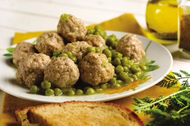 Krišku suvog hleba potopite u malo mlake vode. Dobro ocedite, dodajte mleveno meso, so i biber. Sve dobro izmešajte. Od ove mase pravite loptice i uvaljajte u brašno. U posudu stavite dve kašike ulja, zagrejte i propržite loptice sa jedne i druge strane, dodajte seckani crni i beli luk i šargarepu. Pržite kratko, dodajte grašak, sok od paradajza, vodu, so i seckani peršun. Ostavite da krčka oko 35 minuta, uz povremeno mešanje.