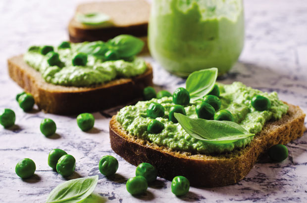 Na ulju propržite sitno isečenu glavicu crnog luka i propasirani beli luk, dodajte grašak i šolju vode, na tihoj vatri dinstajte dok grašak ne smekša. Začinite ga, dodajte mirođiju i peršun, pa uz mešanje dinstajte još desetak minuta, uz povremeno dolivanje vode. Grašak propasirajte u blenderu, dodajte brašno razmućeno u malo mlake vode, pa uz stalno mešanje kuvajte još kratko. Dobijeni pire namažite na kriške hleba.