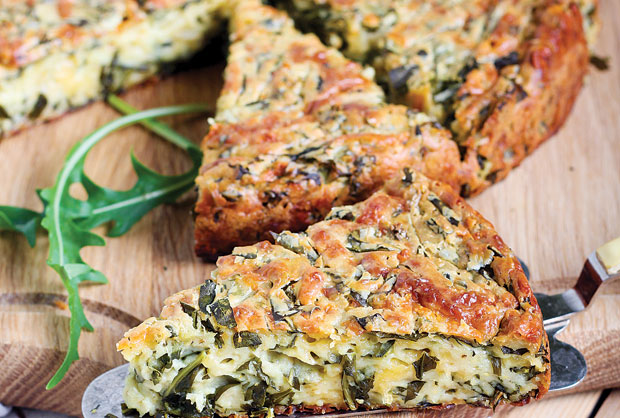 Umutite jaja, dodajte ulje i jogurt. Izgnječite sir i ubacite ga u smesu sa jajima, pa dodajte izmešano brašno sa praškom za pecivo. Posolite po ukusu i na kraju umešajte rukolu. Sipajte smesu u pleh i pecite oko 30 minuta na 180 stepeni.