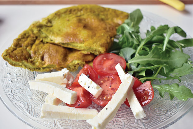 Rukolu blanširajte kratko, ocedite i izdinstajte sa mladim seckanim lukom na pola kašike ulja. Jaja penasto umutite sa parmezanom, mlekom i malo soli. U tiganju zagrejte ostatak ulja, sipajte rukolu i ispecite omlet. Servirajte uz mladi sir, paradajz i rukolu.