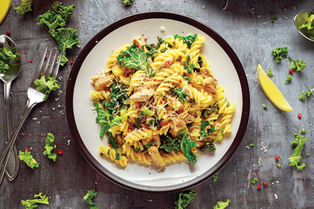 Skuvajte fuzile u slanoj vodi. Piletinu isecite na komadiće, začinite i izdinstajte. Pomešajte testeninu sa mesom, stavite svežu rukolu, izrendajte kačkavalj i sipajte parmezan. Ukrasite jelo sitnim komadićima crvene paprike ili čeri paradajza.