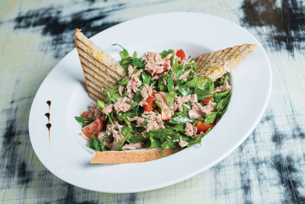 Tunjevinu ili sardinu pomešajte sa sitno seckanim paradajzom i rukolom. Začinite po želji. Prelijte maslinovim uljem i sokom od limuna. Servirajte u činiju ili tanjir sa tostiranim hlebom. Možete dodati i komadiće avokada.