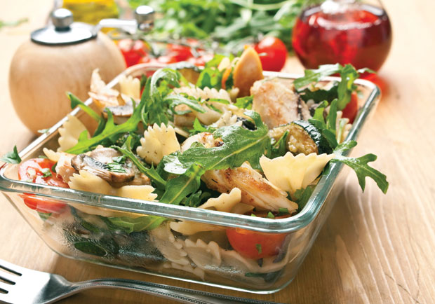 Obarite testeninu u slanoj vodi. Piletinu iseckajte na komadiće, začinite i ispržite. Pomešajte meso sa testom, dodajte opranu rukolu i čeri paradajz. Po želji dodajte blago propržen susam ili prelijte uljem od bundeve.