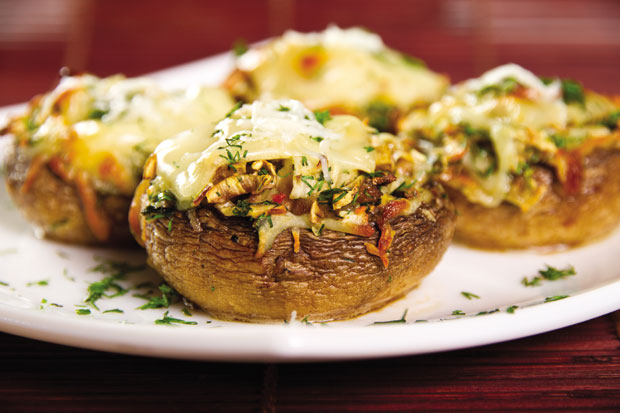 Opranim pečurkama pažljivo uklonite drške. Propržite ih na belom luku i ostavite da se ohlade, pa dodajte krem-sir, parmezan, peršun, malo mlevene paprike, so, biber. Filom punite pečurke, odozgo stavite komadiće trapista, poređajte ih u tepsiju, na papir za pečenje. Pecite ih oko 25 minuta na 200 stepeni.
