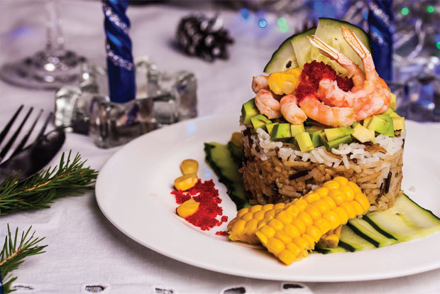 Potrebno je: 400 g pirinča dugog zrna, avokado, 30 ml soka od limete, po 1/2 kašičice mlevenog kumina i soli, 2 pune kašike sitno iseckanog peršuna ili korijandera, 20 većih škampa, 2 kašike ulja, 4 čena sitno iseckanog belog luka, 2 kašičice rendane korice limete, šaka smrznutog ili svežeg graška