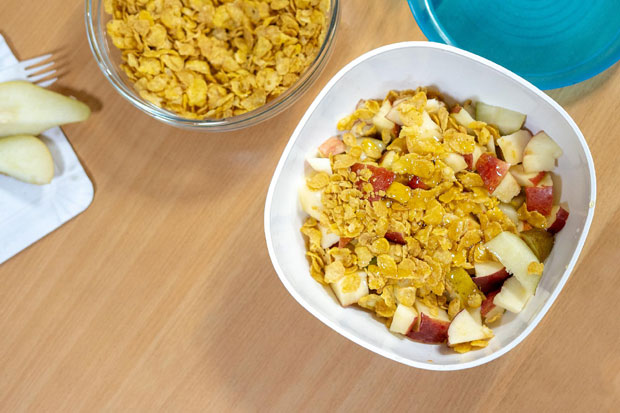 Jabuke i kruške iseckati, dodati izdrobljeni kornfleks, med i malo limunovog soka i sve to pomešati i sipati u činiju i poslužiti.