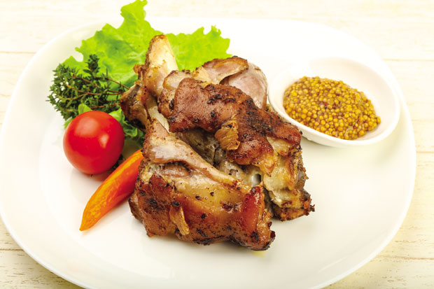 Potrebno je: 2 svinjska kotleta (450 g), 1/2 kašičice soli, 2 kašike senfa, 1/2 kašičice bibera, beli luk (po želji)