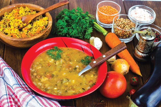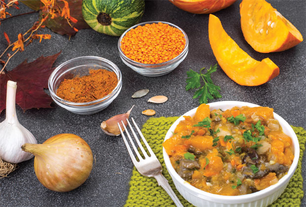 Na maslinovom ulju propržite praziluk i beli luk, dodajte sočivo, pa nalijte paradajz pireom i dospite malo vode. Krčkajte dok sočivo ne omekša. Dodajte naseckan krompir i bundevu, vegetu, đumbir i so, pa krčakjte pet minuta. Potom dodajte seckanu jabuku i pečurke i sve ukrčkajte, nalivajući sa pomalo vode. Pobiberite i servirajte sa njokama.