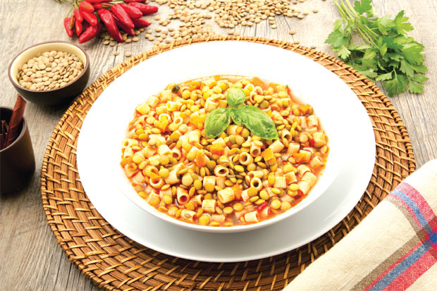 Potrebno je: 200 g sočiva, 200 g sitne testenine, 150 g pančete, velika glavica crnog luka, paprika, šargarepa, kocka povrtne supe, 1 l soka od paradajza, 2-3 čena belog luka, lišće celera i peršuna, kašika gustina, so, biber, bosiljak, 100 g parmezana, ulje