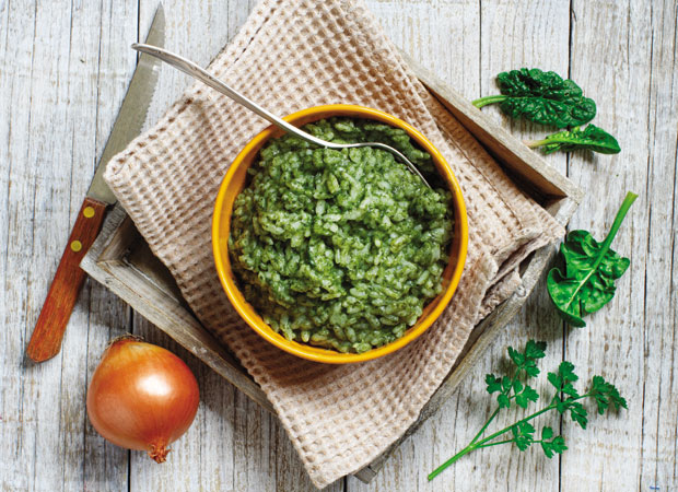 Potrebno je: 50 g pirinča okruglog zrna, 50 g lišća maslačka, 20 g crvenog luka, 1/2 čaše belog vina, po 20 g parmezana i putera, ulje, lovor, bistra supa od povrća