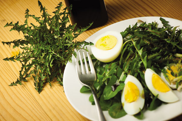 Potrebno je: 2-3 kašičice ulja, sveži listovi maslačka, tvrdo kuvana jaja, suva slanina, 2-3 kašike sirćeta, 2-3 kašike vode, so, mladi luk ili vlašac