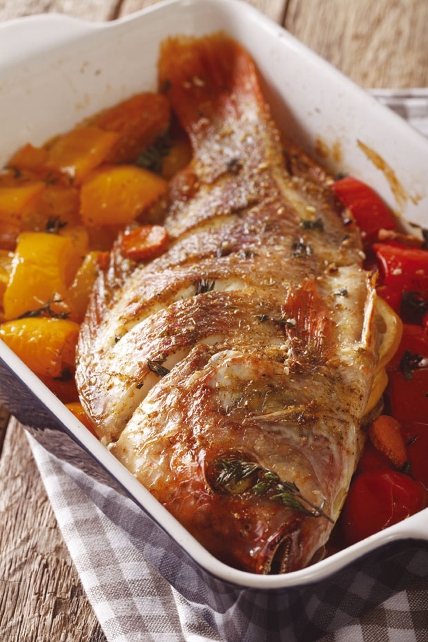 Po očišćenoj i opranoj (pod mlazom vode) ribi nakapajte limunov sok, pospite je jednom kašikom univerzalnog začina i ostavite da odstoji pola sata. U vatrostalnu posudu, na malo ulja, stavite pripremljenu ribu, krompir isečen na veće komade, narezanu papriku, luk i masline. Pomešajte maslinovo ulje, vino, kašiku suvog začina i beli luk isečen na listiće. Time prelijte povrće i ribu. Pecite oko 40 minuta u rerni zagrejanoj na 200 stepeni.