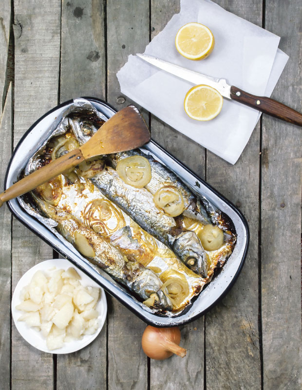 Potrebno je: 1 kg skuše, morska so, peršun, beli luk u prahu, maslinovo ulje, limun