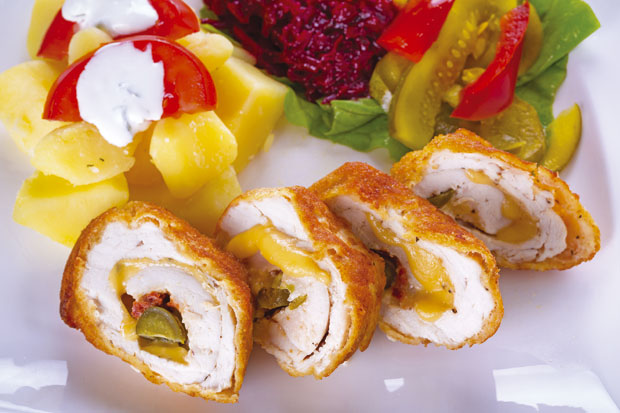 Pileći file isecite na tanje ali veće komade. Zatim ih izlupajte preko providne folije i ostavite da odstoje pola sata u smesi od ulja i začina. Preko piletine stavite malo ajvara, poređajte kačkavalj, seckane maslinke i urolajte. Zakačite čačkalicama da se meso ne bi odmotalo. Pileće rolnice uvaljajte najpre u brašno, pa u jaja umućena sa malo vode i brašna, na kraju u prezle i pržite ih u tiganju na vrelom ulju. Rolovanu piletinu možete da služite uz bareni ili prženi krompir i svežu salatu.