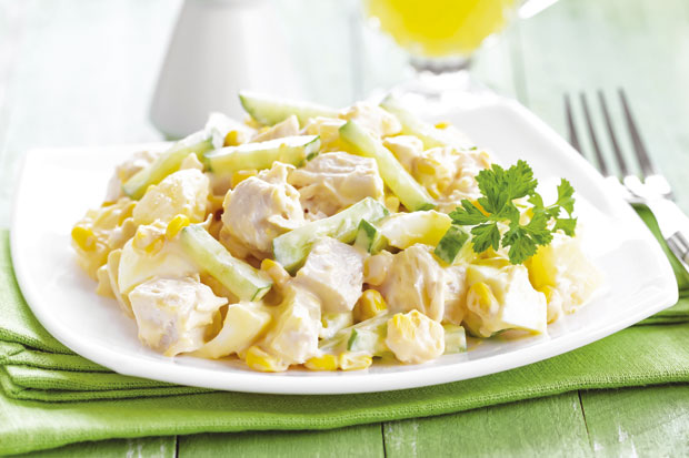 Piletinu skuvajte pa iseckajte na kockice. Krastavac očistite i isecite na tanke šnite, a kukuruz dobro ocedite od vode. Sve zajedno sa mesom stavite u dublju činiju, dodajte soli po potrebi, majonez i lagano pomešajte. Salatu možete da dekorišete listom peršuna ili svežim povrćem.