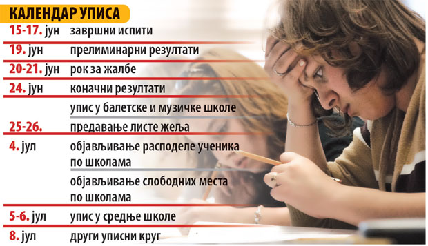 - Sve je pod kontrolom i svi smo spremni - rekla je "Novostima" Snežana Marković, pomoćnica ministra prosvete i predsednica upisne komisije. - Važno je da se deca odmore, naspavaju i da se ne plaše. Završni ispit nije nikakav bauk, već samo obična provera znanja.