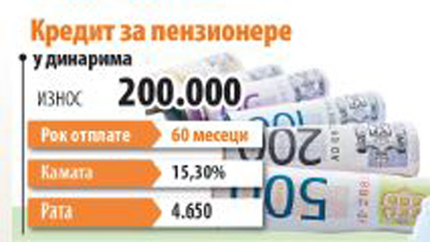 Tako, na primer, ukoliko neki penzioner uzme kredit od 200.000 dinara na pet godina, mesečno će vraćati po 4.650 dinara. Kamata je 15,30 odsto.