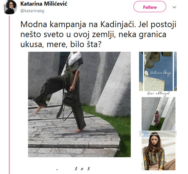SNIMANjE ovog modnog editorijala na Kadinjači verovatno bi prošlo neopaženo da se nedavno nije podigla slična bura nakon što je jedna australijska kompanija, koja se bavi prodajom naočara, snimila reklamni spot i fotografije u Jasenovcu. Reakcija javnosti naterala je ovu kompaniju da povuče sav reklamni materijal uz izvinjenje, i napomenu da su oni samo želeli da istaknu lepotu arhitekture ovog spomen-kompleksa.