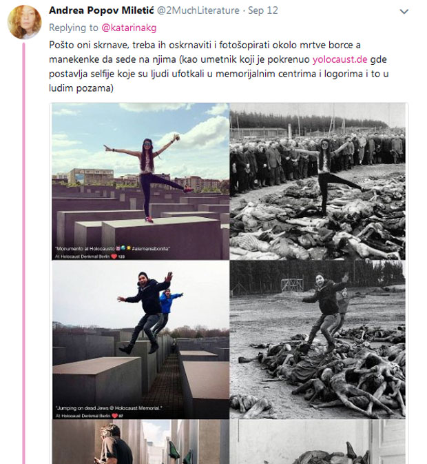 - Svi modeli su bili prikladno odeveni, odnosno zakopčani do grla. Svaka fotografija napravljena je u prisustvu kustosa muzeja, i sve su date na uvid direktorki. Nijedna nije snimljena na mestu gde je kosturnica, tako da ni na koji način nije narušen ovaj monumentalni kompleks - kazala nam je Jelena Karanac. - Neverovatno je da su se za fotografije prvo "zakačile" nekakve "tviterašice", valjda im je to zanimanje. Mi nismo željni senzacije, niti nam je potreban ovakav vid publiciteta, samo smo želeli da budemo modna kuća prepoznatljiva po promovisanju Srbije i njenih lepota...