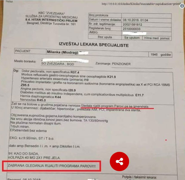 U izveštaju lekara, a koji se kao poplava širi društvenim mrežama, piše da se penzionerka žalila na bolove u grudima, pojačanu nervozu, a sve to zato što iznervirala gledajući rijaliti.