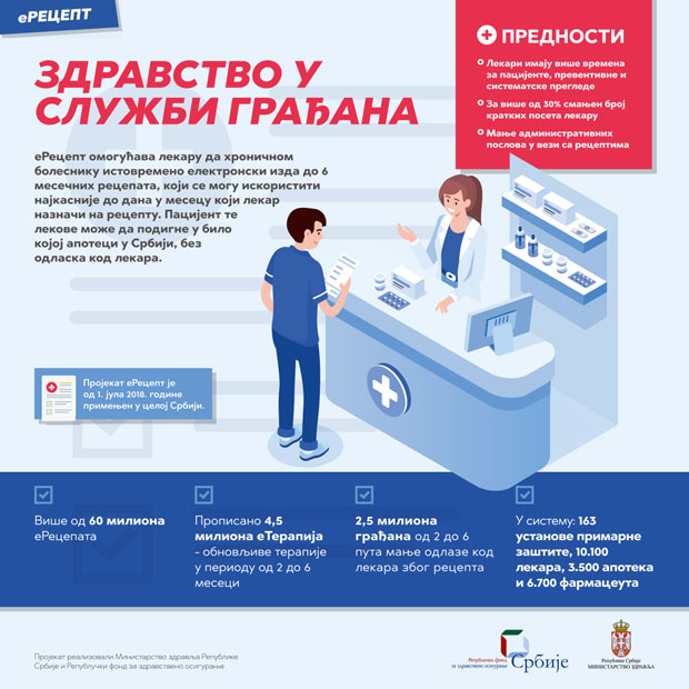 Za godinu dana, otkako je sistem uveden, izdato je više od 60 miliona e-recepata, od kojih su dosad realizovana 3.455.842. Na ovom receptu terapija se hronično obolelima propisuje za od dva do šest meseci, što znači da u apoteku "automatski stižu" recepti za taj period terapije. Prvi treba da se realizuje u roku od sedam dana, a ostali sedam dana ranije ili sedam dana kasnije od datuma dospeća.