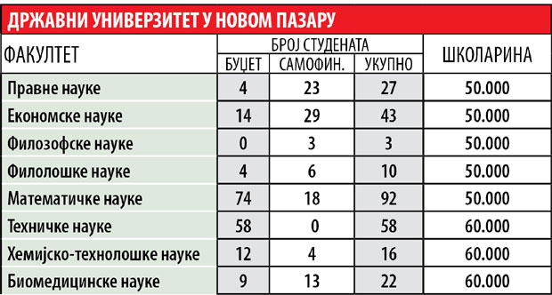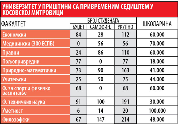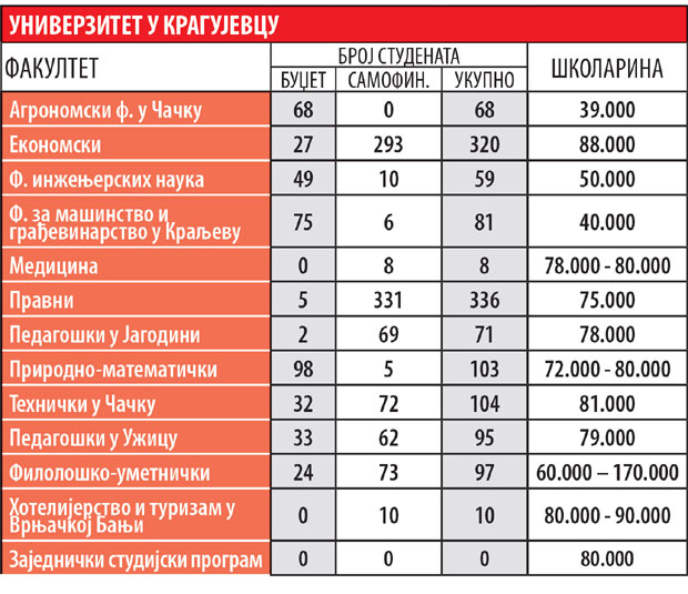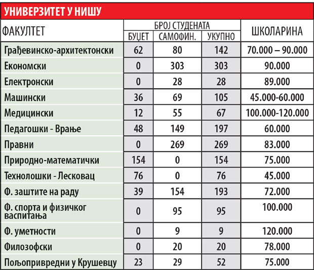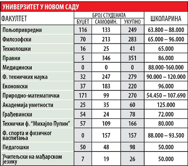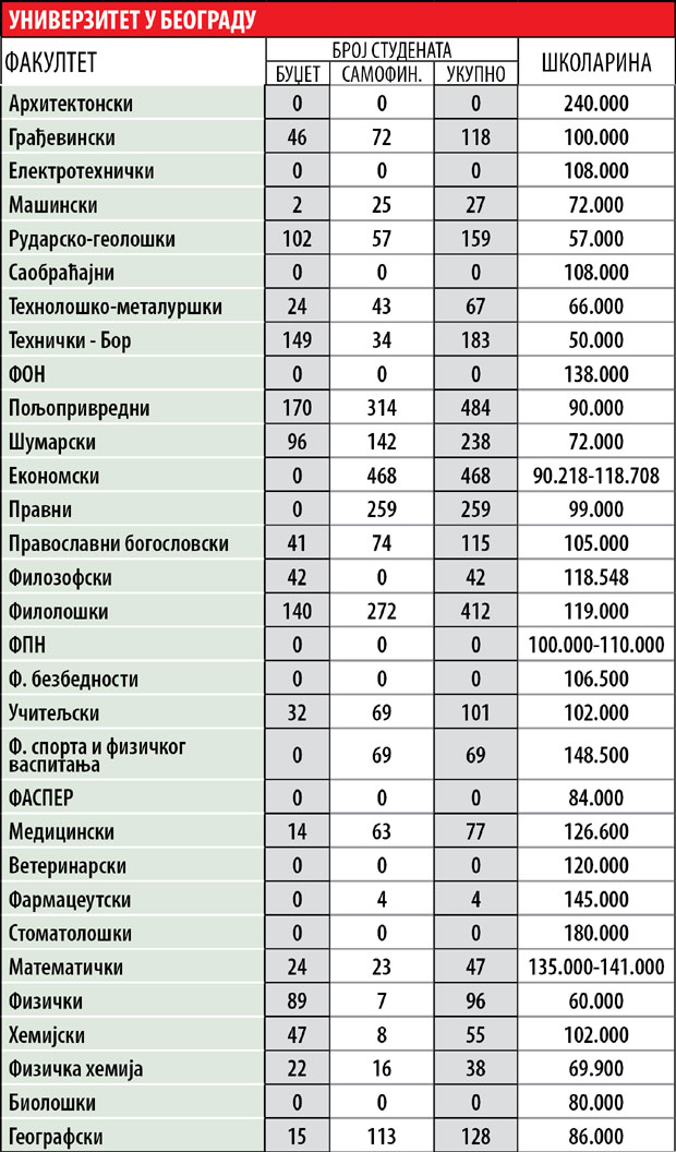 Na Beogradskom univerzitetu, koji je naš najstariji i najpopularniji univerzitet, na budžet može da se upiše još 1.055 maturanata, a za samofinansirajuće studente ostalo je 2.154 mesta. Na Univerzitetu u Nišu na budžetu je ostalo 450 mesta, a samofinansirajućih 1.260, na Prištinskom univerzitetu, sa sedištem u Kosovskoj Mitrovici, na budžet može da se upiše još 515 budućih brucoša, a svoje školovanje da plaća njih 517. U Novom Pazaru ostalo je 210 budžetskih mesta i 96 samofinansirajućih, u Kragujevcu ima 413 mesta na budžetu i 939 samofinansirajućih. U Novom Sadu preostalo je 640 mesta na budžetu i 1.638 za samofinansirajuće studente.