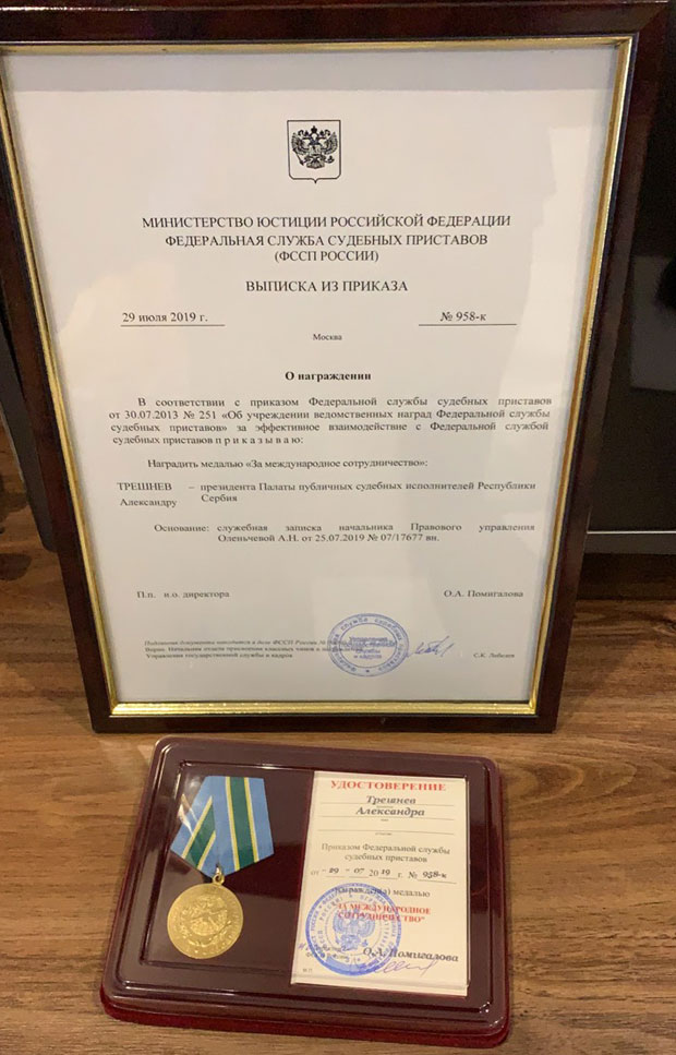 | ORDEN MINISTARSTVA PRAVDE RUSIJE ALEKSANDRI Trešnjev nedavno je Ministarstvo pravde Rusije dodelilo orden za izuzetne doprinose u međunarodnoj saradnji. - Orden predstavlja izvanrednu čast, a istovremeneo i potvrdu dobrih odnosa koji postoje između naše komore i Federalne službe sudskih izvršitelja Ruske federacije. Zahvaljujući ovako dobrim odnosima u prilici smo da u neposrednoj razmeni iskustava sa kolegama iz Ruske federacije razmenimo najbolju praksu i međusobno utičemo na podizanje standarda postupanja u oblasti izvršenja – kaže predsednica Komore izvršitelja. ![]() |