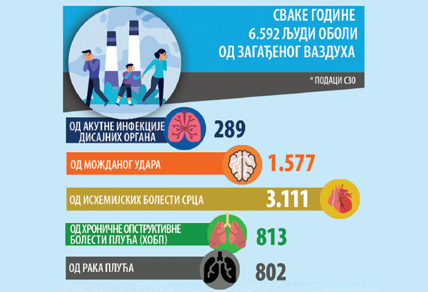 - Izloženost visokom zagađenju vazduha u trajanju od 15 ili 20 godina dovodi do moždanog i srčanog udara, hronične opstruktivne bolesti pluća, raka pluća i infekcija donjih organa za disanje - kaže dr Elizabet Paunović, konsultant Svetske zdravstvene organizacije i specijalista medicine rada, saobraćaja i sportske medicine. - SZO je procenio da u Srbiji oko 6.500 ljudi prevremeno umre svake godine usled izloženosti zagađenom vazduhu.